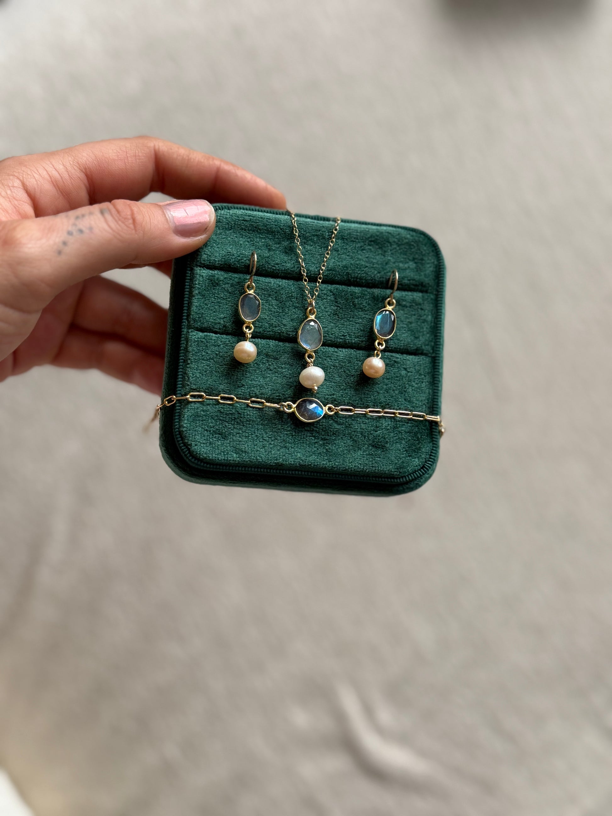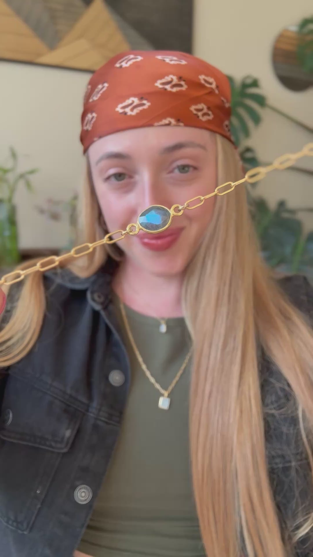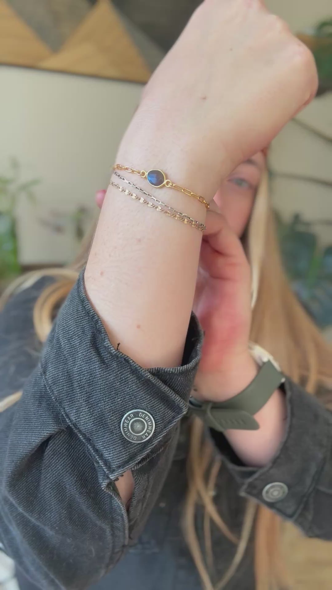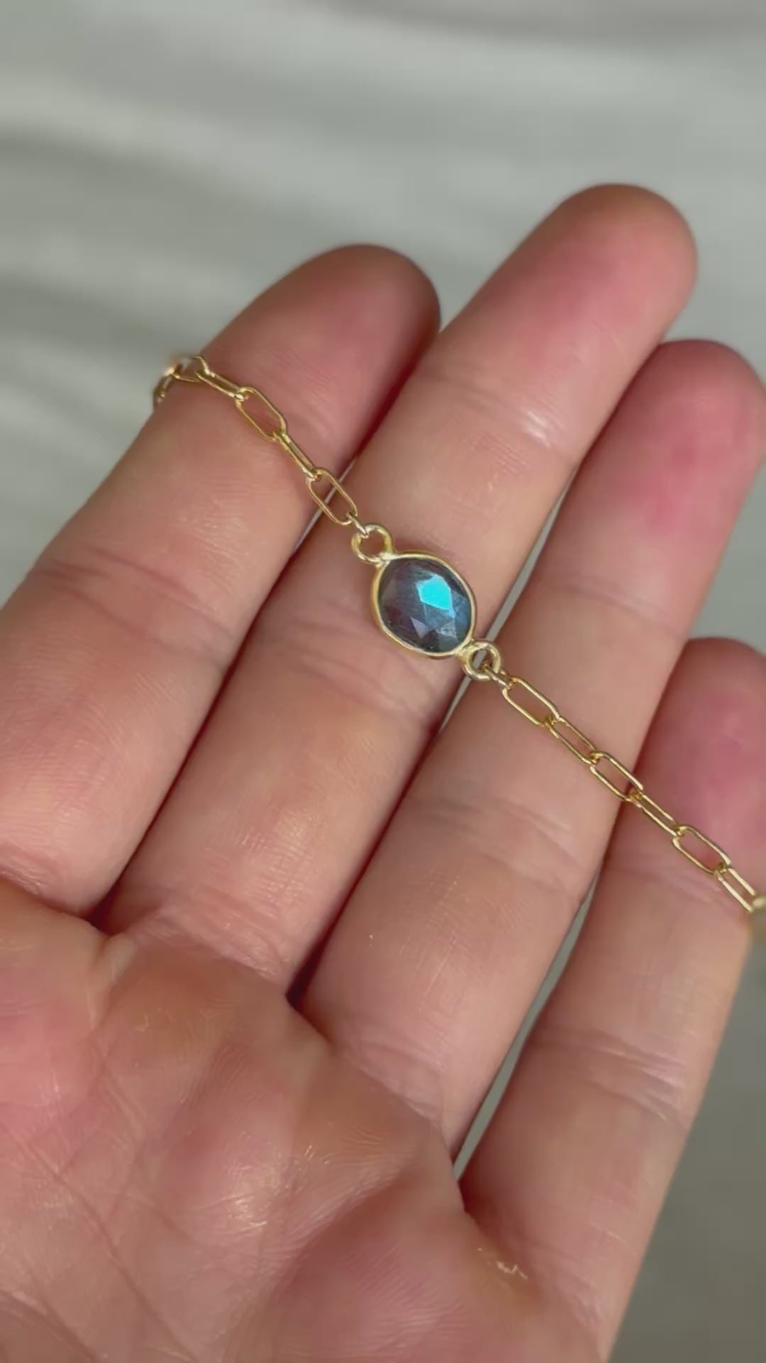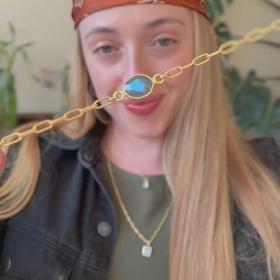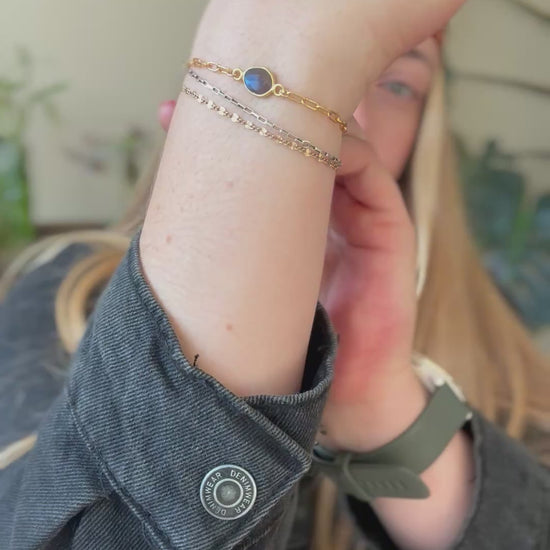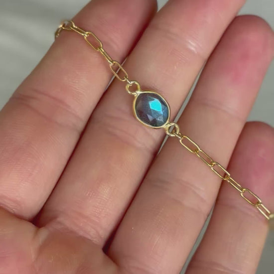 Made with a 14k gold fill paperclip chain with an extender to fit wrist sizes 6-7, and a gorgeous blue flash labradorite.