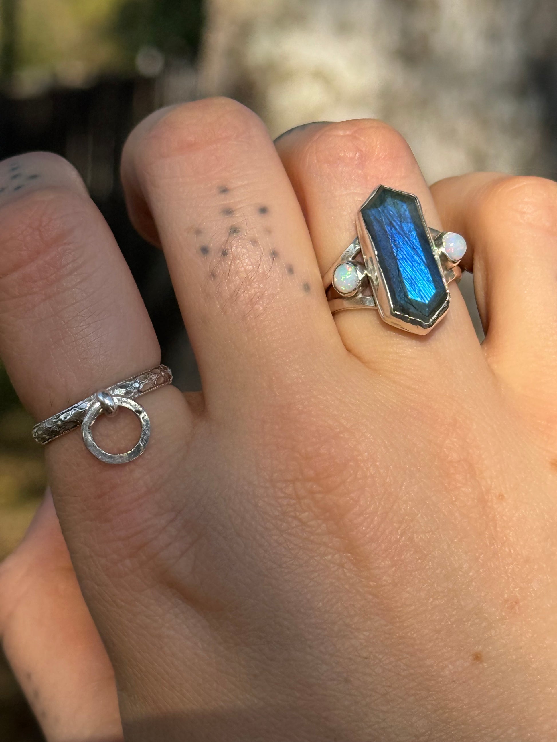 This ring was one that reminded me that it’s ok to try again, it was first made horizontally and after I finished its final polish, I realized that I didn’t love how it turned out. I reminded myself as an artist we can try again, so I removed the stones and started over from scratch, creating this beauty instead.