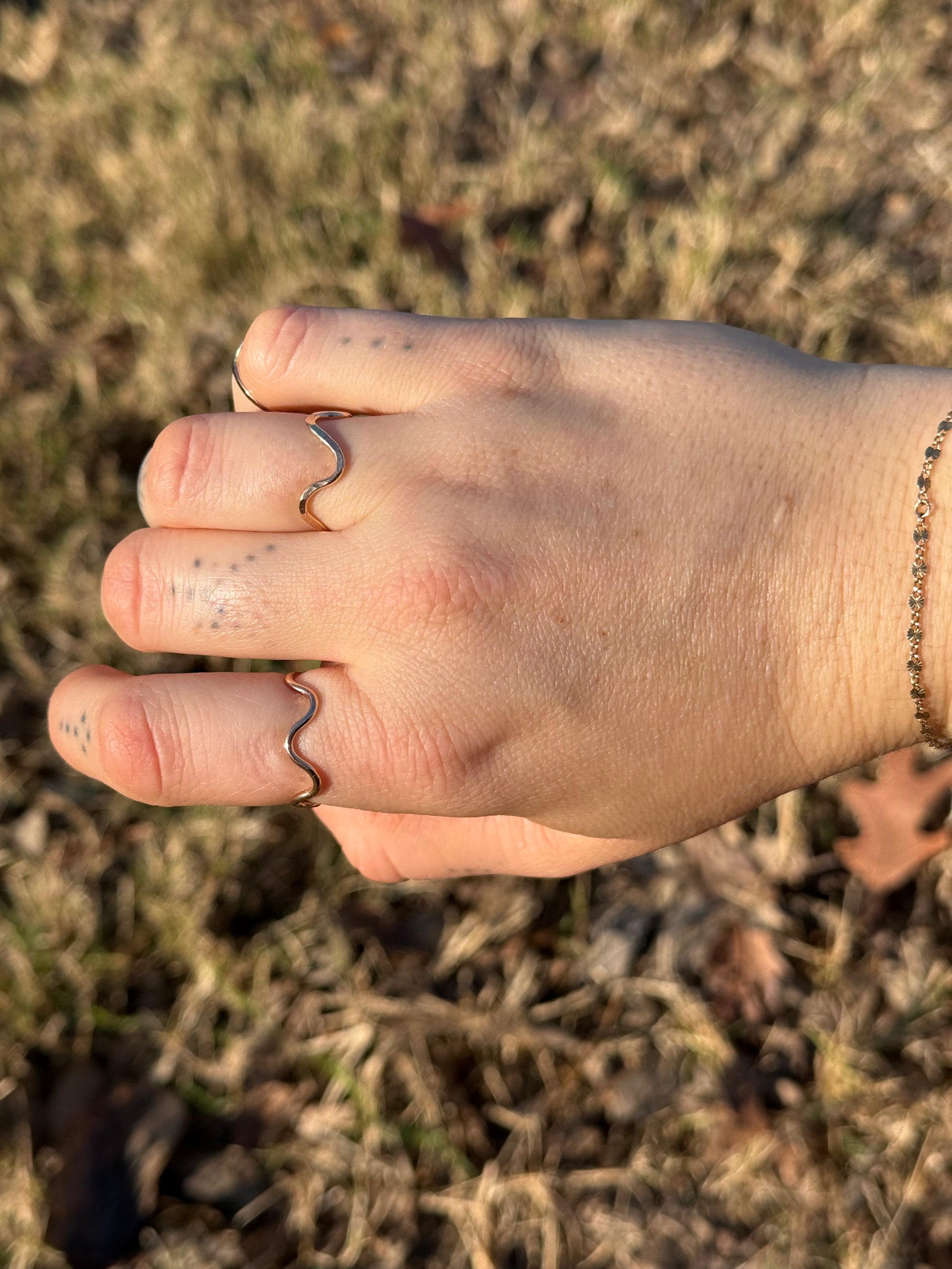 handmade in a hammered gold fill band with freeform squiggles, each ring is completely one of a kind and so much fun to spin & wiggle. (sorry I had to rhyme) This ring is 14k gold fill which is second best to solid gold, and 10+ x thicker than gold plating. meaning you can wear it daily without tarnishing.