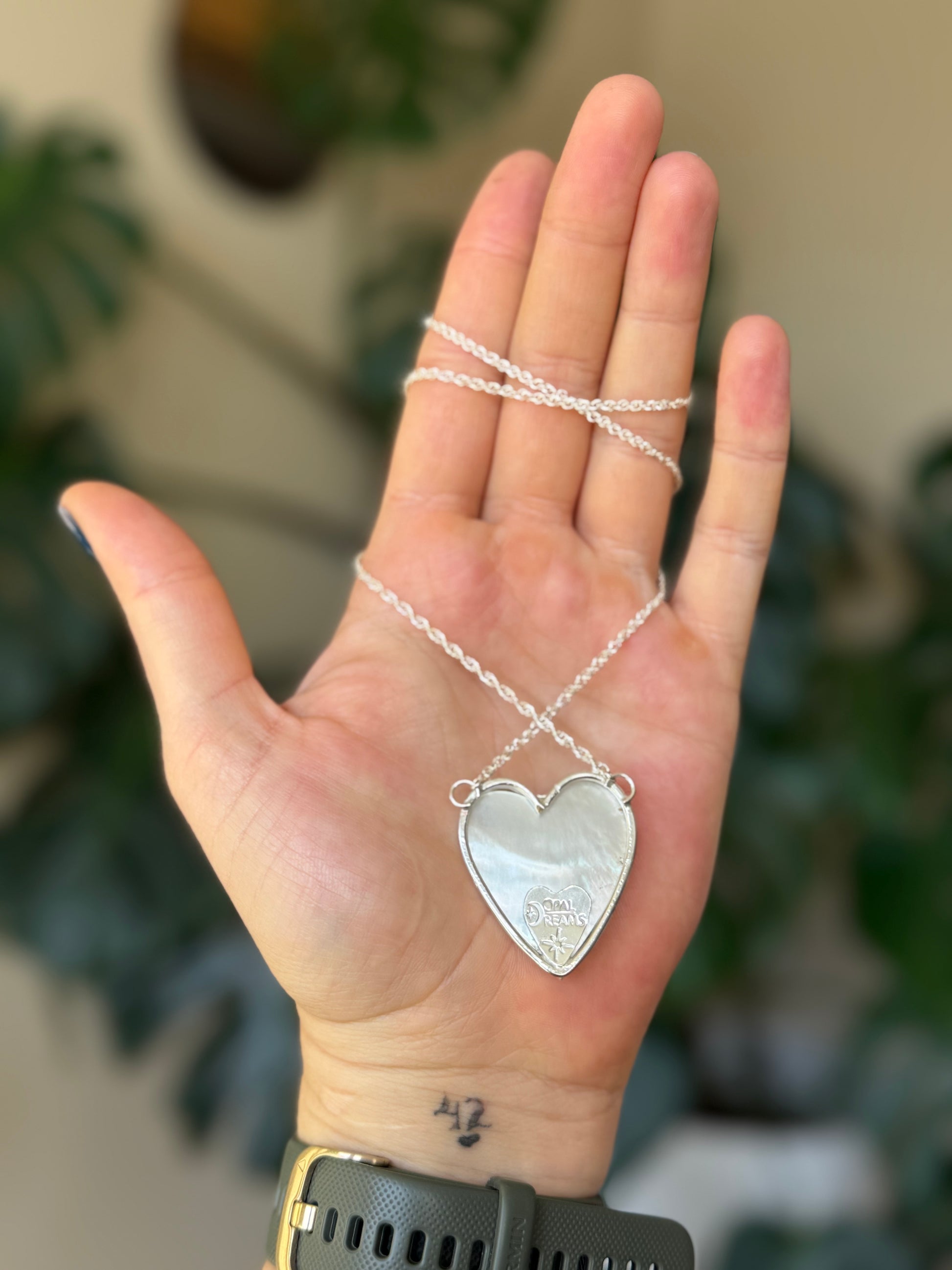 A gorgeous Mabe Blister pearl shaped like a heart is set in sterling silver with an open back so its calming properties sit softly above your heart. The necklace is 18 inches with an extender.