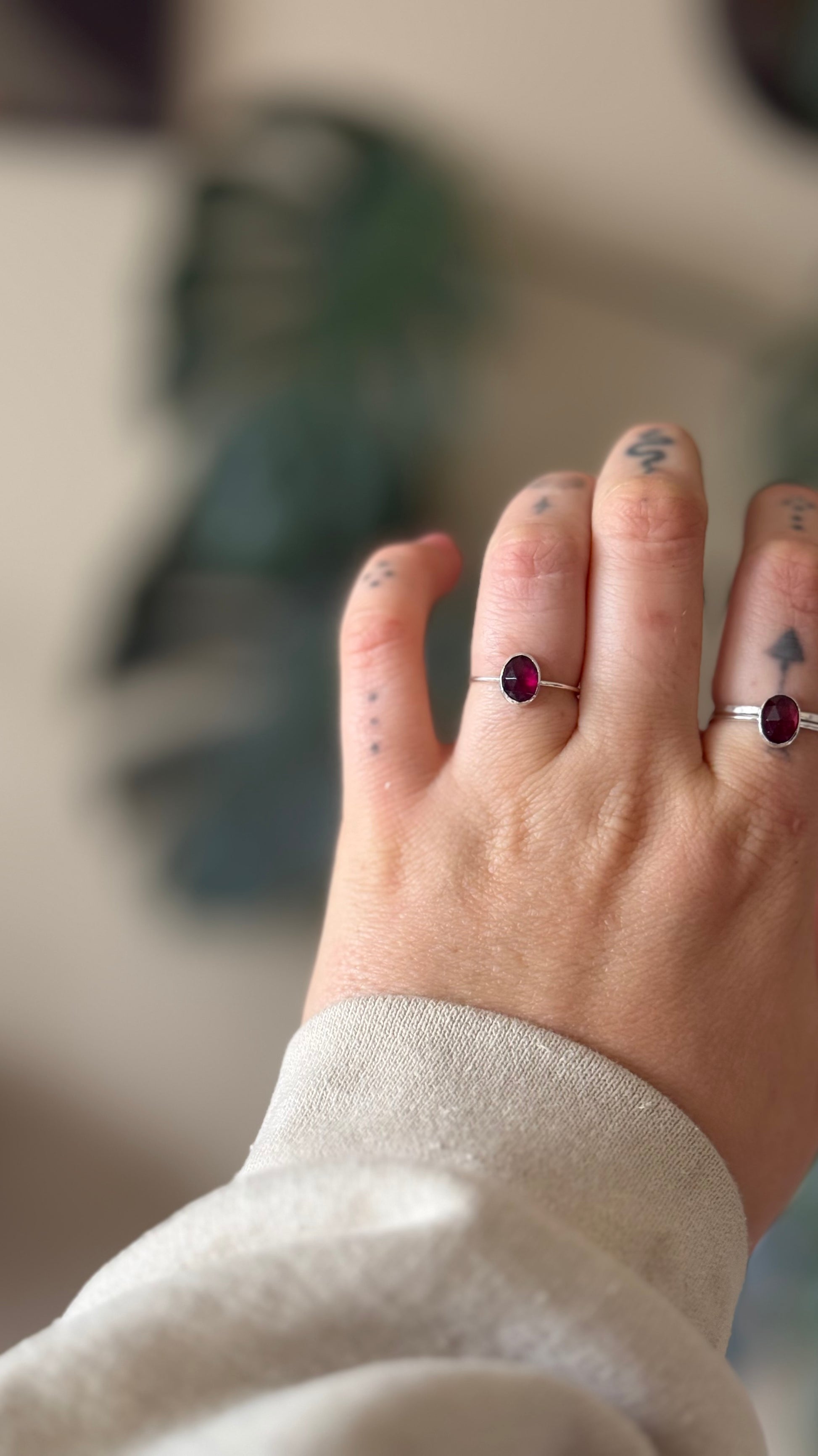 Wear it alone or stack it with a matching band, this ring is versatile and oh so cute! It’s made with a gorgeous fuchsia colored rose cut garnet.