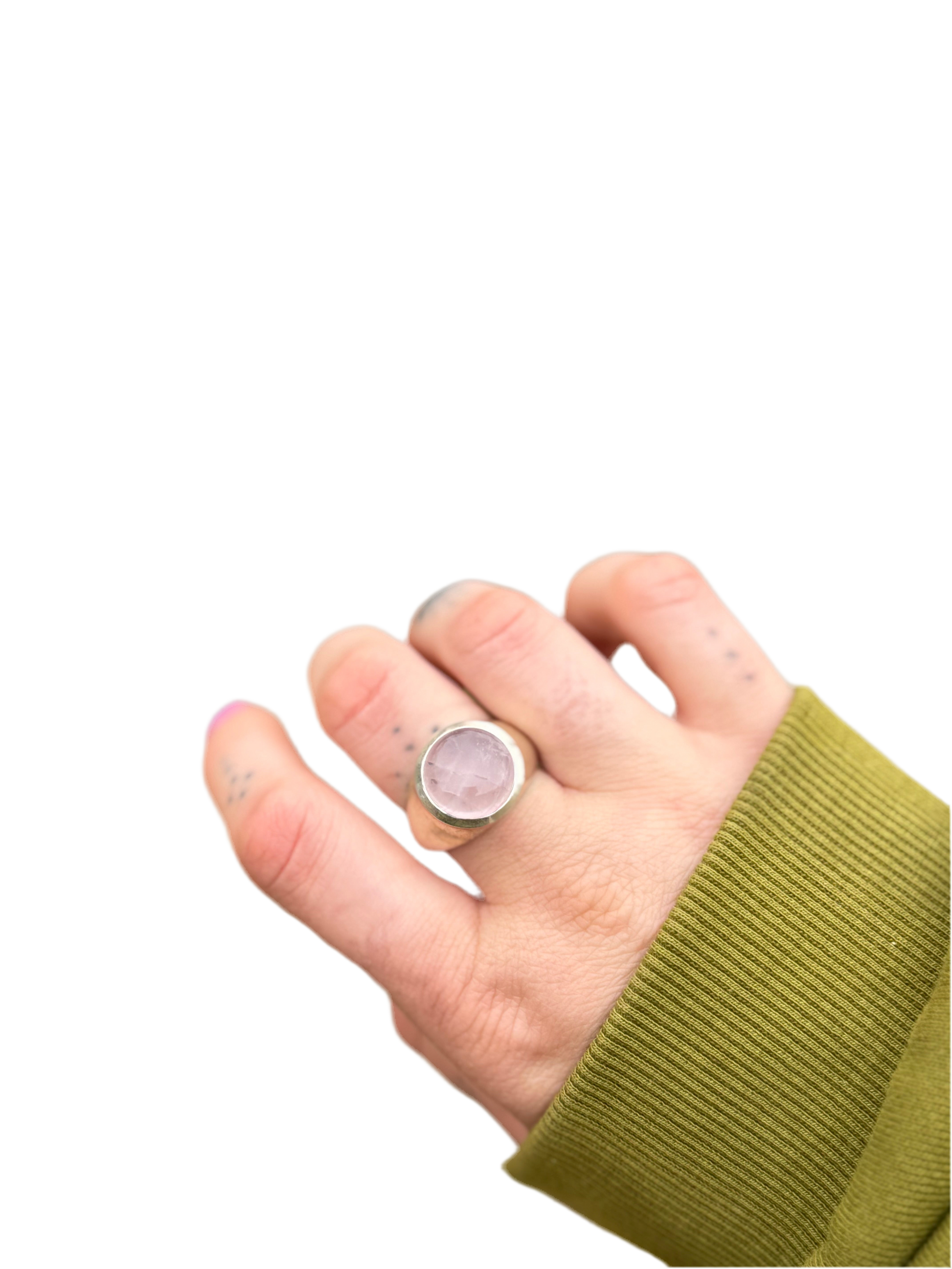 Rose Quartz, a stone for connecting with our self love is set on a thick unisex signet style band. Making it perfect for just about anyone!
